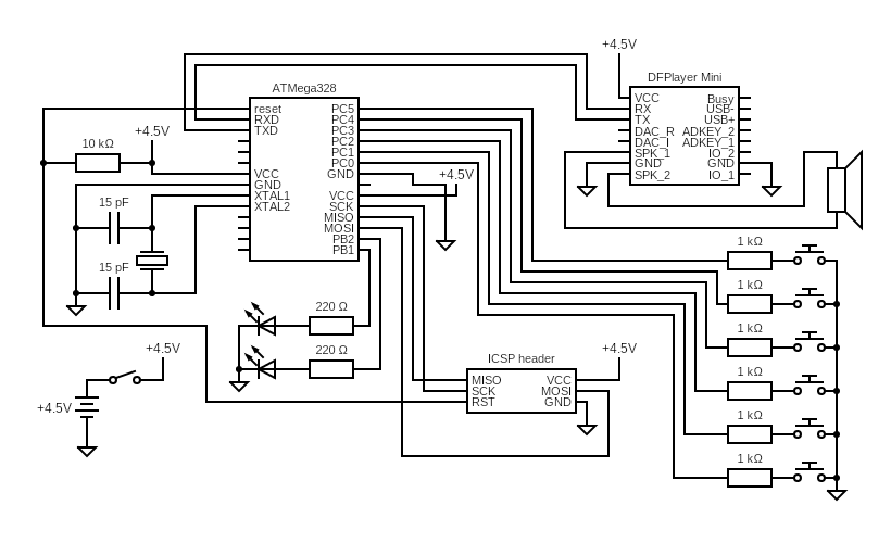The electric circuit is built around a DFPlayer Mini audio module and an ATmega328 microcontroller. Other components are placed around the microcontroller. This includes the following: