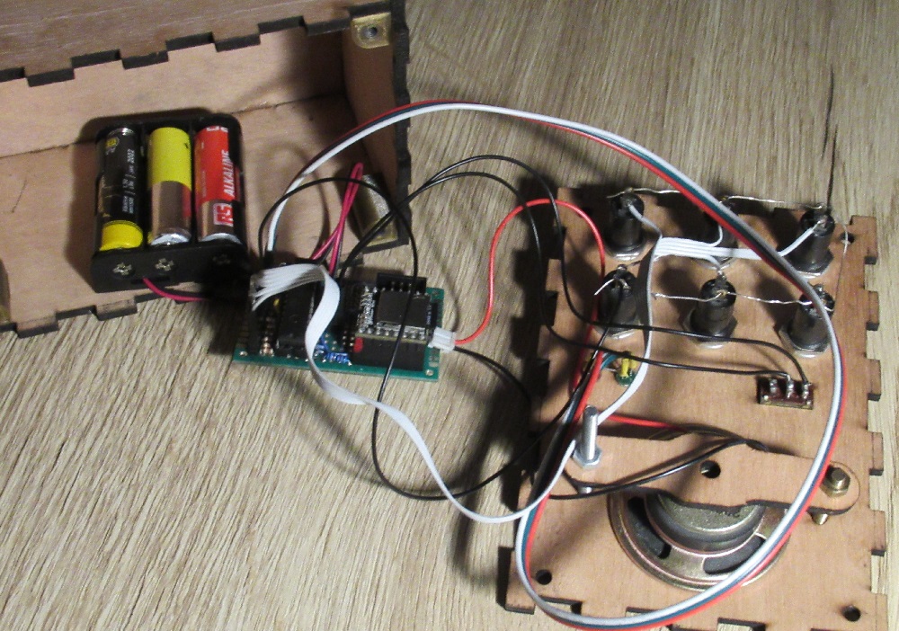 The audio module can directly drive the speaker. The connection to the speaker is made underneath the sound module. The microcontroller has a socket for easy replacement. A socket for the audio module is created by soldering two female headers onto the circuit board. Male pin headers and matching wire connectors are used for all other connections to the circuit board.